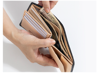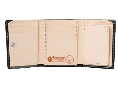 三つ折りでありながらも機能性も充実したコンパクト財布。コンパクトなのに多様なポケットで、左側と中央には2枚のカードポケットと後ろ側にオープンポケットを装備。お札も折らずに入ります。
